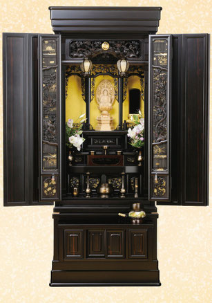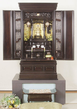 台輪上には大引き出し、引き戸内部は奥行きがあり、大型の仏具も収納でき機能的です。ご本尊様は精密で艶やかな柘植材。御仏具は紫檀仏具と彫金水鳥彫りのセットです。貴家の家紋もお付け致します。紫檀経机、座布団も含まれます。